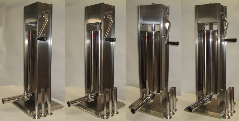 Sausage MakingA. Using meat mincer with sausage filling nozzlePrepare meat by running it through the fine grinding plate and mix sausage ingredients until all the spices are evenly distributed. Choose the largest grinding plate and install it with the sausage filling nozzle without the knife. Using knife, while filling sausages, reduces the filling pressure. B. Using sausage fillerMix sausage ingredients until all the components are evenly distributed. Some popular sausage recipes could be found here: beef sausage recipes, pork sausage recipes, venison sausages Set up the handle to upper gear axel and move it clockwise to get pistol out of the cylinder. Pull the top of cylinder out and fill it with sausage mixture. Do not over fill! Push cylinder back into position. Move handle from top axle to the lower gear axel. Pull on the sausage casing. Fill the casing moving handle clockwise. |